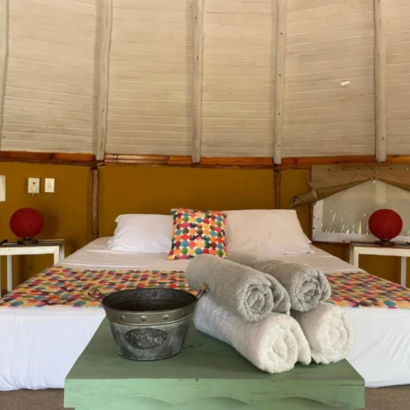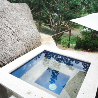 Este bungalow cuenta con una bañera de hidromasaje y una tina de spa. Con 1 dormitorio, este bungalow dispone de 1 baño con ducha, una sala de estar y una terraza donde puedes relajarte. El bungalow tiene entrada privada, muebles de exterior, vistas al jardín y una malla catamarán para disfrutar al máximo de la […]